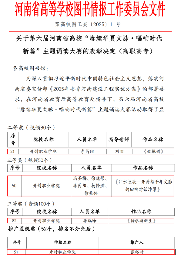 近日,第六届河南省高校“赓续华夏文脉·唱响时代新篇”主题诵读大赛圆满结束。本次大赛由河南省高等学校图书情报工作委员会与“学习强国”河南学习平台联合主办,面向全省高校开展,旨在传承中华文脉、弘扬时代精神。我校积极组织师生参与,经多轮选拔和激烈角逐,最终荣获二等奖1项、三等奖2项。同时,两位老师分获优秀指导老师奖和推广星锐奖。