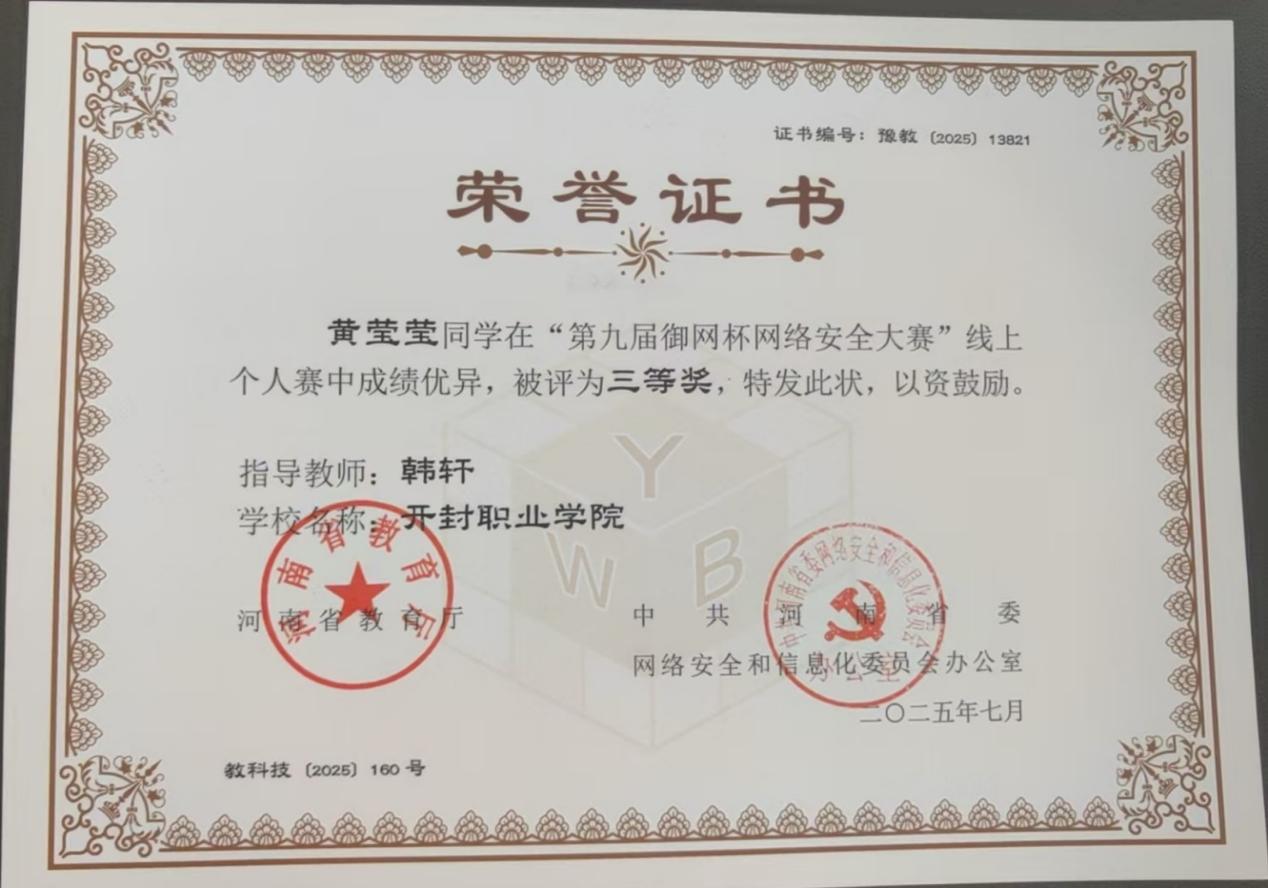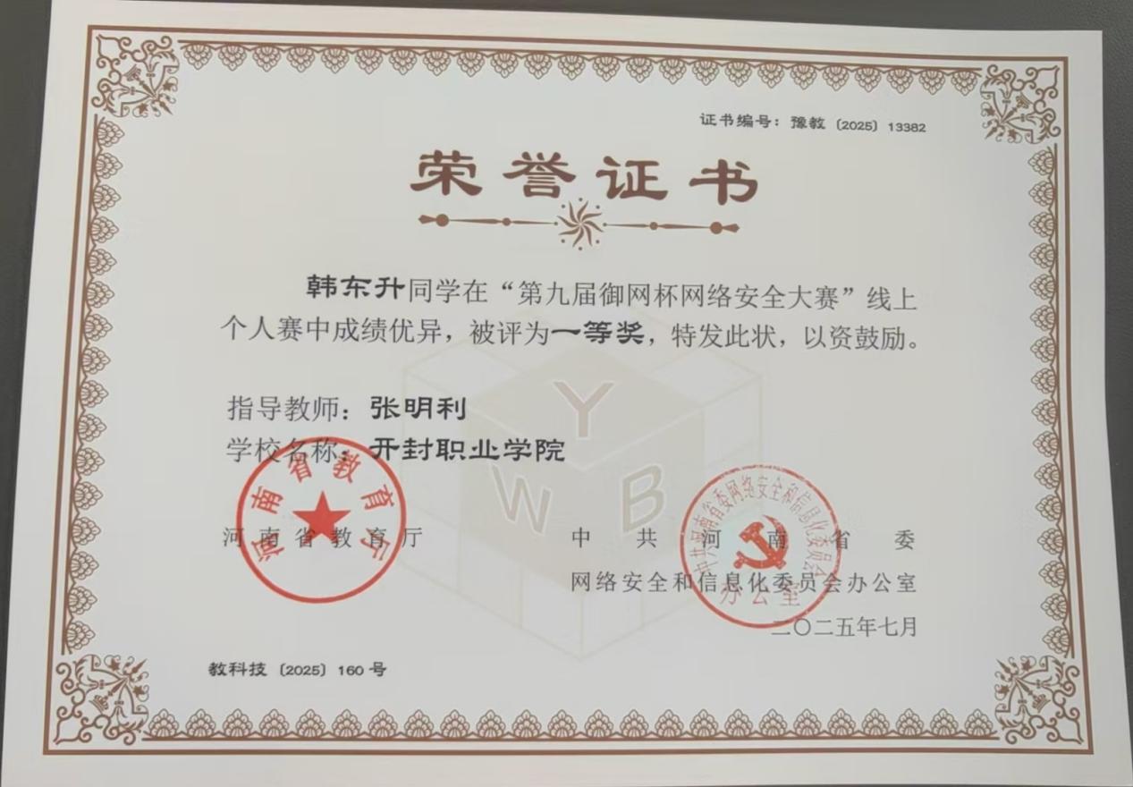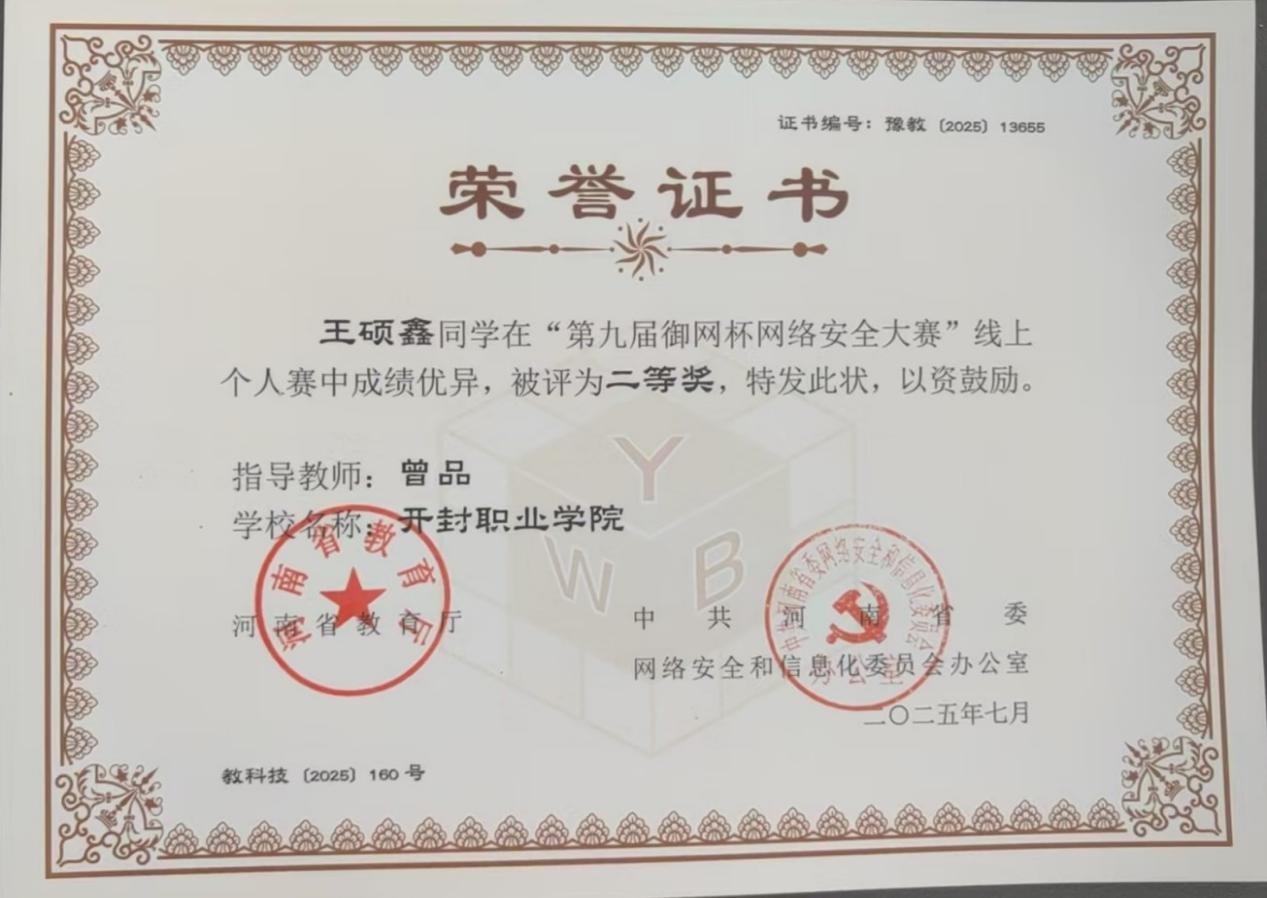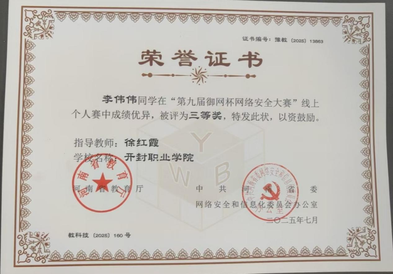 近日,河南省教育厅公布了第九届御网杯网络安全大赛获奖名单。信息工程学院大数据技术(网络管理与应用)专业学生韩东升获线上个人赛一等奖,王硕鑫获线上个人赛二等奖,黄莹莹、李伟伟获线上个人赛三等奖;由三名学子崔航、王硕鑫、韩东升组成的开职闯关团队荣获高职高专学生组团体赛三等奖。