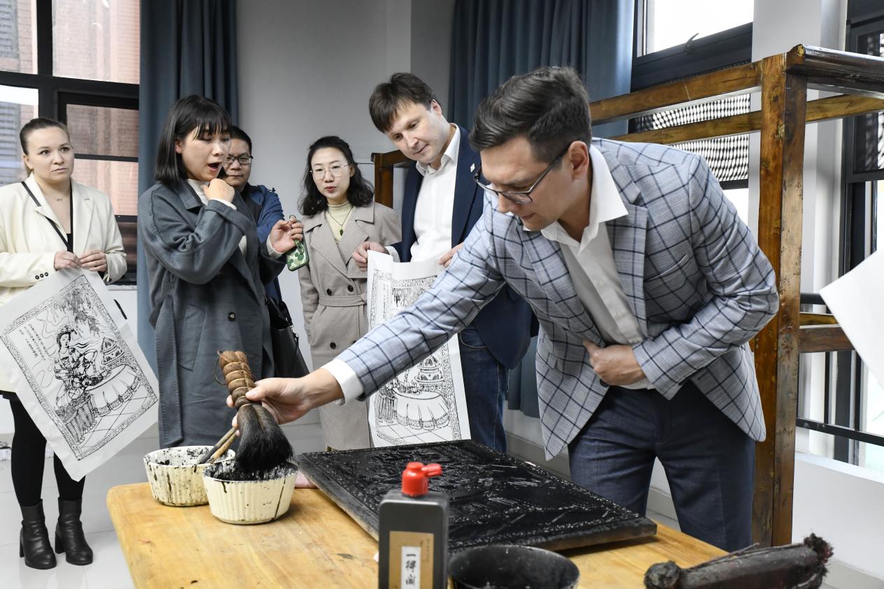 座谈会前,代表团一行参观我校小米集团(河南)产教融合基地、京东数字经济产业学院、新一代信息技术实验实训中心、非遗大师工作室等场所,详细了解我校在校企合作、产教融合等方面的实践成果,亲身体验汴绣、朱仙镇木版年画、北宋官瓷等传统文化项目,并对我校在技艺传承与创新融合方面的探索表示高度赞扬。