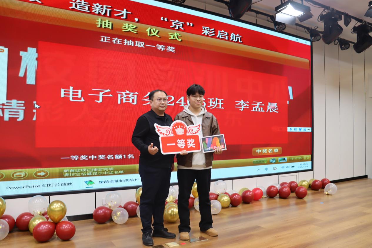 表彰结束后,多轮抽奖环节共抽取了幸运奖24名、三等奖12名、二等奖8名与一等奖1名,U型枕、体脂秤、充电宝、蓝牙耳机以及平板等礼品逐一送出,未中奖学生也收获了京东主题伴手礼,整场活动互动热烈,掌声不断。