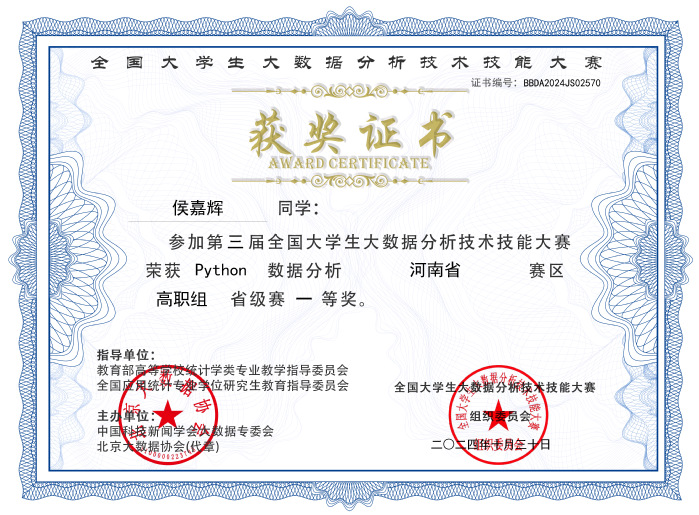 侯嘉辉,信息工程学院大数据技术2307班学生。获得2024-2025学年“劲崧”奖学金一等奖,第三届全国大学生大数据分析技术技能大赛赛区河南省 Python数据分析高职组省级赛一等奖,第三届全国大学生大数据分析技术技能大赛Python数据分析高职组、全国总决赛二等奖,2025年6月份校技能大赛一等奖。在校期间,侯嘉辉专注于专业技能的提升,这些经历让他对数据世界充满了更浓厚的兴趣。