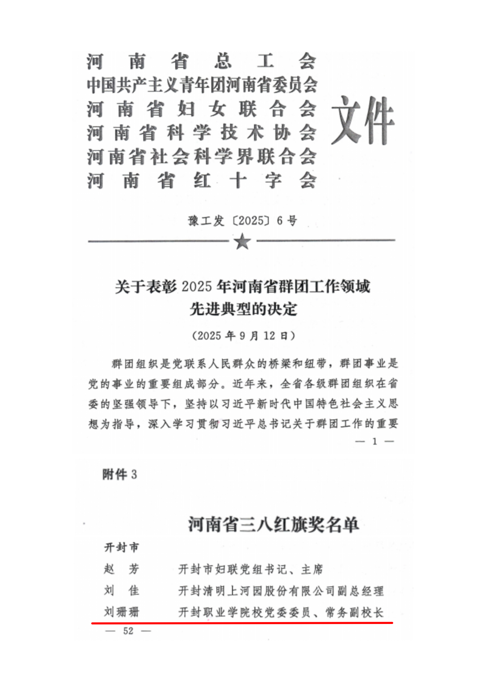近期,省总工会、团省委、省妇联、省科协、省社科联、省红十字会联合下发《关于表彰2025年河南省群团工作领域先进典型的决定》(豫工发〔2025〕6号),公布荣获2025年“河南省三八红旗奖”先进集体、先进个人的评选名单,我校执行校长刘珊珊凭借其在教育领域作出的卓越贡献,被授予“河南省三八红旗奖”先进个人殊荣。
