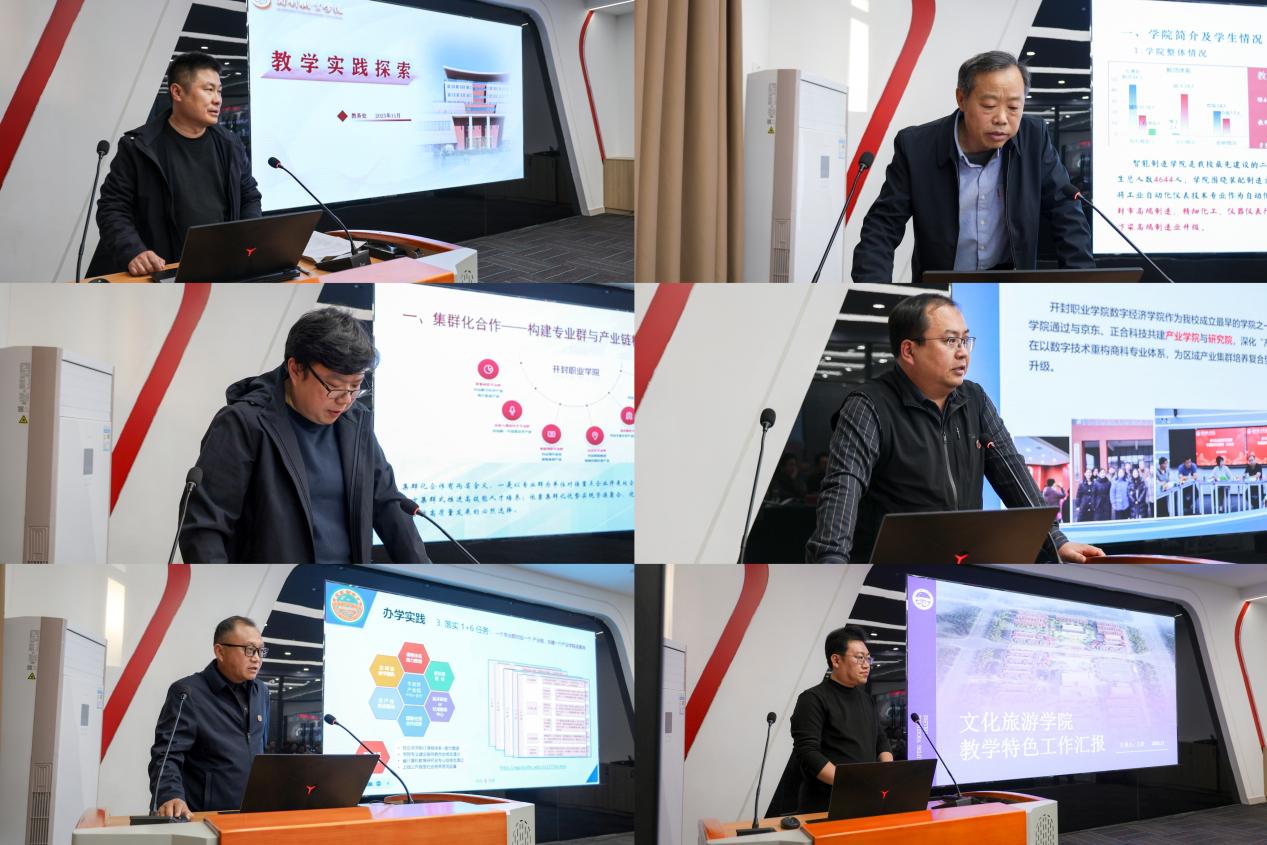 在教学特色汇报环节,教务处处长万海堂、校企合作中心主任王哲、信息工程学院院长张东生、智能制造学院院长李继方、数字经济学院院长李刚、文化旅游学院院长王松等六位部门负责人相继围绕“教育教学改革实践”和“教学特色培育亮点”两大核心维度展开汇报。其间,各部门负责人既系统展现了学校在专业群建设、课堂教学改革、产教融合深化、校企协同育人等领域的特色成果,也坦诚剖析了发展过程中面临的瓶颈,更清晰阐述了未来的攻坚方向,让在场人员对全校教学工作的“特色”与“潜力”有了全面深入的了解。