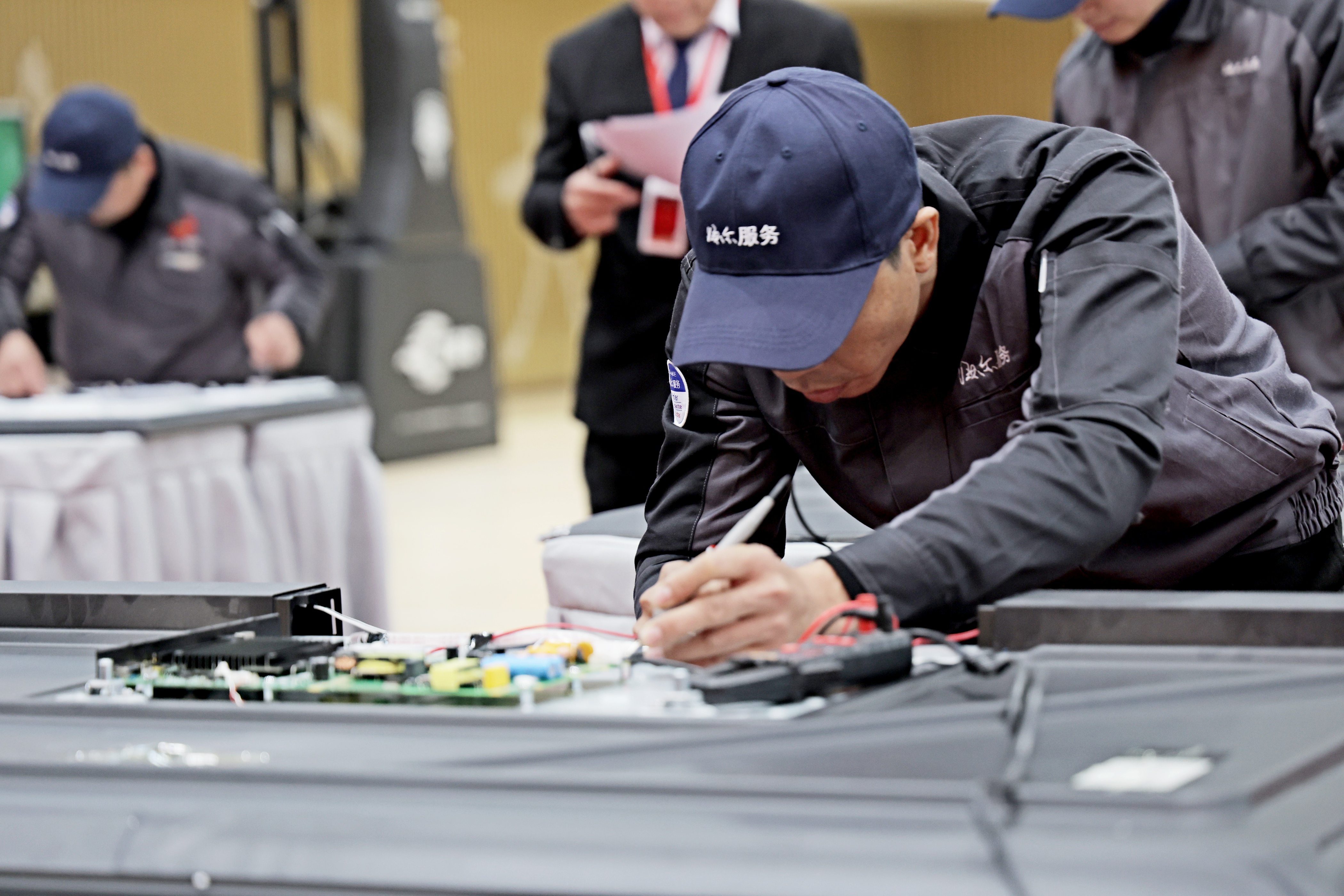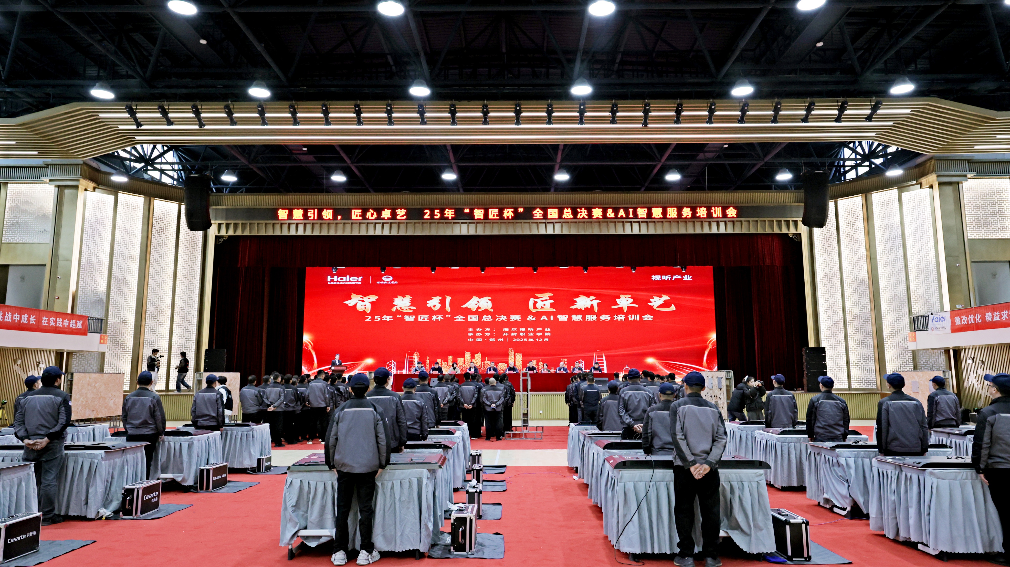 12月3日中午,海尔智家2025年“智匠杯”全国总决赛暨AI智慧服务培训会在开封职业学院圆满落幕。来自全国各地的技能精英齐聚八朝古都开封,以技会友、共话发展。开封市人力资源和社会保障局四级调研员年介丰,开封市祥符区人民政府党组成员、副区长闫泊含,海尔智家视听产业服务总经理陈相东,海尔服务平台培训部长高焕绪等政府、企业领导,开封职业学院副董事长、校长徐仲昆及校领导班子成员出席活动。学校首届“海尔”订单班全体同学全程观摩比赛。