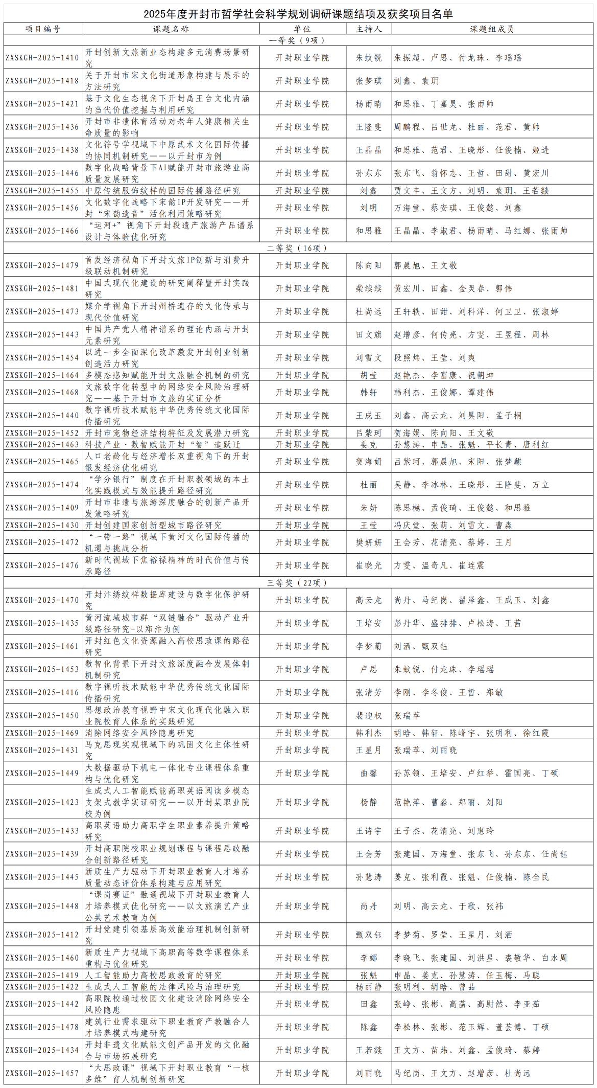 近日,开封市社会科学界联合会公布2025年度开封市哲学社会科学规划调研课题结项及获奖项目情况,我校立项74项课题,获准结项71项,47项获奖,其中一等奖9项、二等奖16项、三等奖22项。结项和获奖课题数量创历史新高。