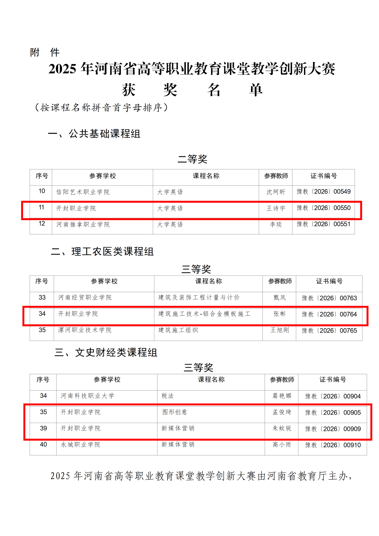 近日,河南省教育厅下发《关于公布2025年河南省高等职业教育课堂教学创新大赛获奖名单的通知》,经校级遴选、省级网评及现场比赛多轮筛选,我校通识教育学院教师王诗宇荣获公共基础课程组二等奖;智能制造学院教师张彬荣获理工农医类课程组三等奖;数字经济学院教师朱蚊锐、文化旅游学院教师孟俊琦荣获文史财经类课程组三等奖。