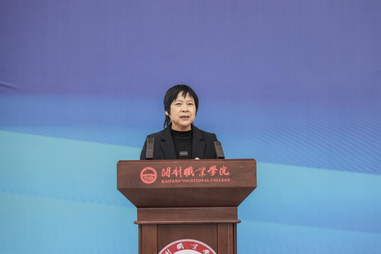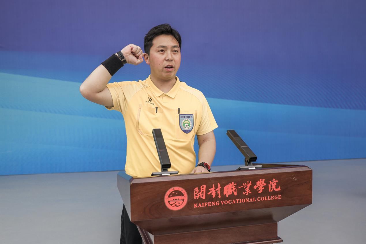 开幕式在庄严的国歌声中正式拉开帷幕,全场人员起立奏唱国歌,嘹亮的歌声回荡在赛场之上。学校体育运动委员会副主任、纪委书记、工会主席翟明君为开幕式致辞,代表学校向到场领导、嘉宾以及参赛人员表示热烈欢迎。她表示,足球是校园体育育人的重要载体,河南省大学生足球联赛是落实体育强国战略、深化体教融合的重要实践。翟明君介绍,学校始终将习近平总书记“健康第一”的教育理念贯穿育人全过程,坚持让每名学生至少掌握一项运动技能、坚持一年级每周4学时体育课、坚持将体育教育与心理健康教育深度融合,校园体育育人成果持续彰显。她寄语全体参赛运动员尊重裁判、尊重对手,赛出水平、赛出风格,充分彰显青年学子昂扬向上的精神风貌与扎实过硬的竞技素养。