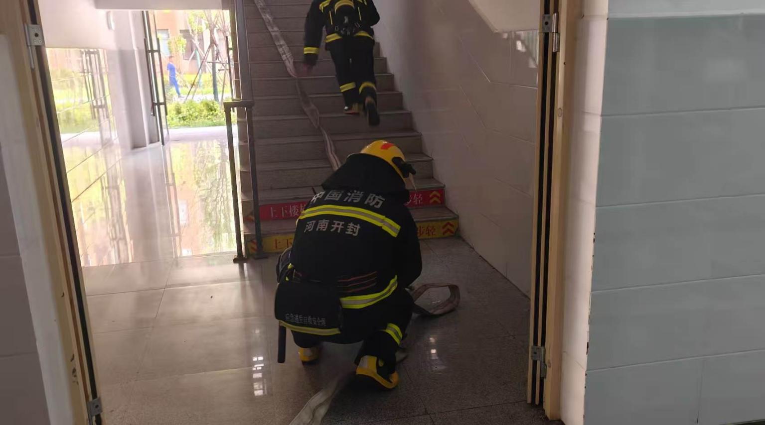 疏散演练结束后,祥符区消防救援大队消防员围绕“校园初期火灾扑救”开展专项实战演练与技能培训。消防员结合校园教学楼、宿舍楼等建筑的消防特点,现场演示了室内消火栓出水、水带快速铺设、接口规范连接等核心操作,详细讲解了水带铺设的力学原理、不同场景下的扑救要点,以及校园常见电气火灾、明火火灾的处置注意事项。