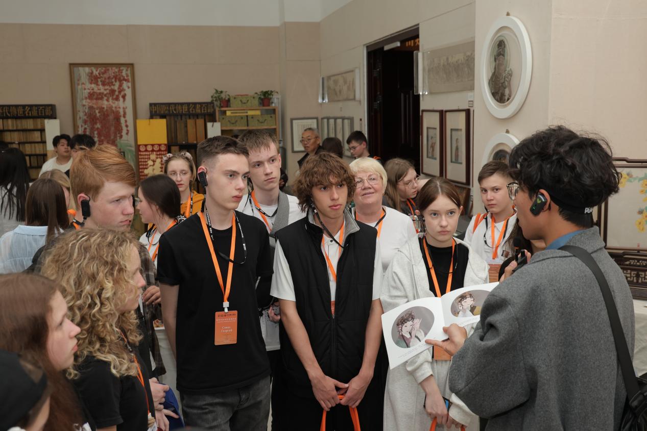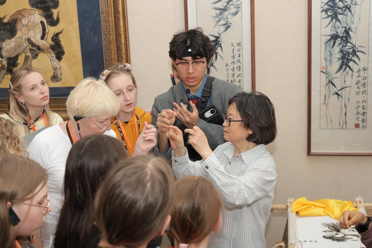 在专业讲解员与俄语翻译的默契配合下,俄罗斯研学团的青少年们依次走进了苗炜汴绣艺术展厅、“清明上河园”专题展、朱仙镇木版年画艺术展及明清皇家用品展四大展区。
